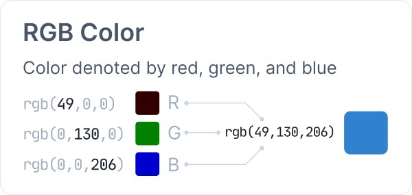 RGB stands for Red Green Blue, and is written with a notation rgb(R, G, B), with the values of R, G, and B mapping to a number from 0-255. The closer to 255, the more Red, Green, or Blue is mixed into the color. It refers to the actual colors on a screen that combine together to form a pixel.